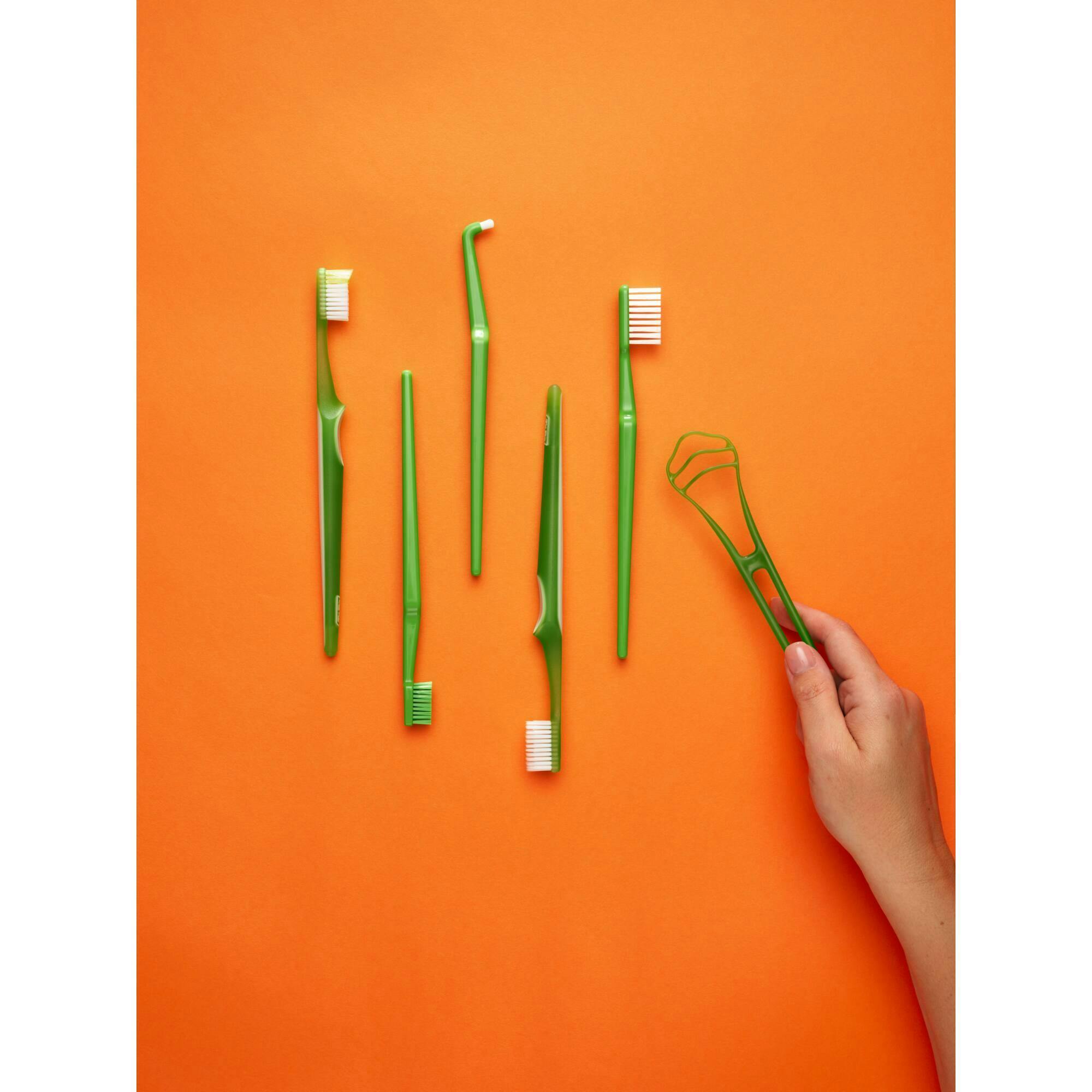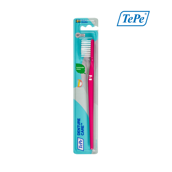 TePe Denture Care là một bàn chải đặc biệt với các sợi lông chải dài, chắc chắn để đảm bảo khả năng tiếp cận tốt và làm sạch hiệu quả tất cả các bề mặt mà không gây ảnh hưởng nào đến hàm giả tháo lắp. Bàn chải TePe Denture Care được thiết kế giống bàn chải đánh răng thông thường và cổ bàn chải có thể uốn cong về phía sau tăng tính linh hoạt khi sử dụng. Bằng cách thay thế nguyên liệu hóa thạch thô bằng nguyên liệu thực vật trong quá trình sản xuất bàn chải, Tepe đã giảm khoảng 80% lượng khí thải carbon trong suốt chu kỳ sản phẩm.